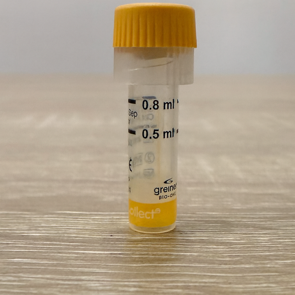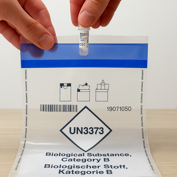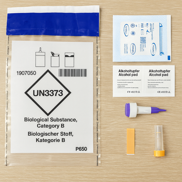 Stecke die Blutprobe zuerst in den Sicherheitsbeutel (der auf dem Bild zu sehen ist) und dann in den Rücksendeumschlag.