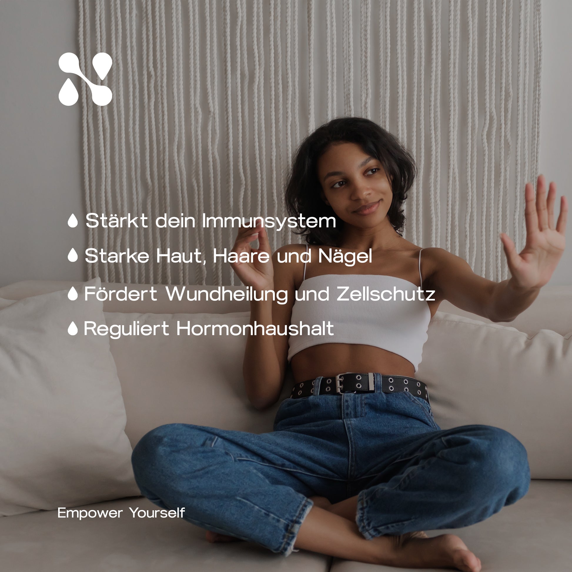 Zink ist an über 300 enzymatischen Prozessen in deinem Körper beteiligt und essenziell für eine starke Abwehr, gesunde Haut und Haare sowie die Wundheilung. Es schützt deine Zellen vor oxidativem Stress, unterstützt die Zellerneuerung und hilft deinem Körper, Infektionen abzuwehren.